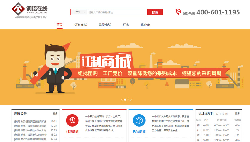 銅鋁在線為有色金屬行業(yè)的電子商務(wù)交易平臺,采用系統(tǒng)自動組批團(tuán)購的方式,將需求相同的客戶組批給統(tǒng)一廠家競價,以組團(tuán)形式在降低買家采購成本的同時降低工廠的生產(chǎn)成本。平臺同時提供現(xiàn)貨采購模式,供用戶實(shí)現(xiàn)快速線上交易。