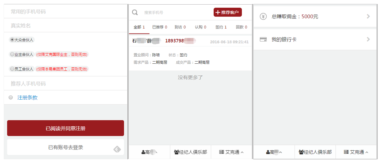 客戶注冊(cè):擁有微信并關(guān)注公眾號(hào),即可注冊(cè)申請(qǐng)成為全民營(yíng)銷(xiāo)系統(tǒng)的用戶(全民經(jīng)紀(jì)人)。注冊(cè)用戶可隨時(shí)通過(guò)微信查看已經(jīng)推薦的客戶信息、購(gòu)房進(jìn)度、傭金結(jié)算情況。